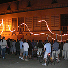 En seconde partie, à la nuit tombée, l'artiste a mis le feu à son installation de fils de bois, illuminant toute la façade de cette construction appartenant au patrimoine liverdunois.
